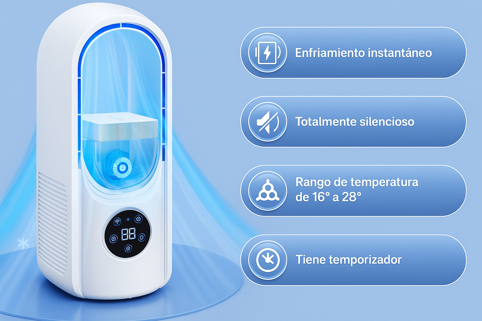 Comparado con un aire tradicional, es más eficiente, más pequeño, portátil, económico… ¡y enfría el ambiente mucho más rápido!